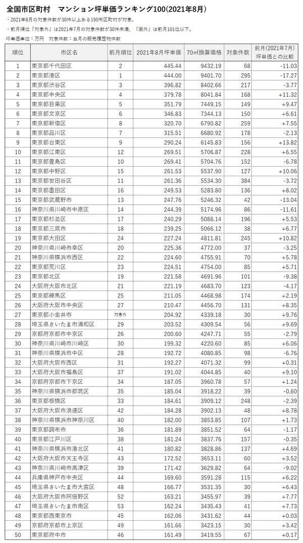 マンションレビュー 21年8月 全国市区町村 マンション坪単価 ランキング100を発表 21年9月16日 エキサイトニュース